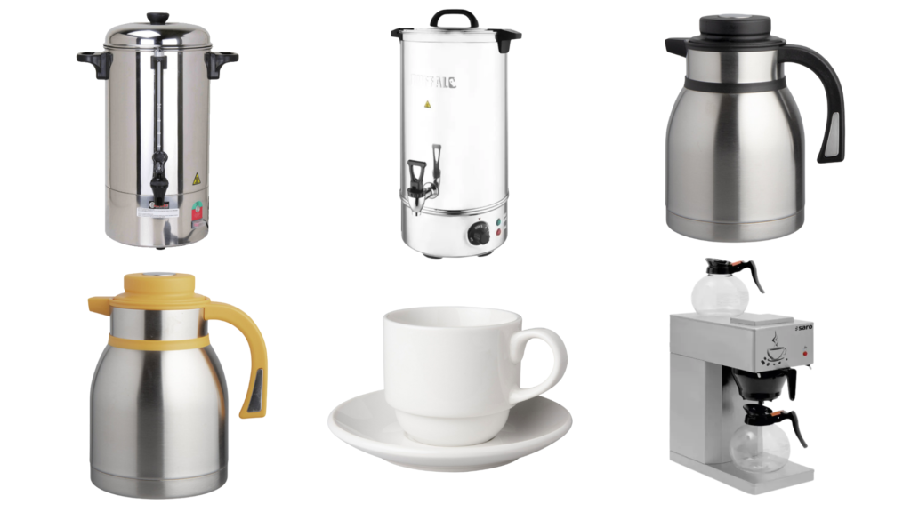 Met percolators, waterkokers en kannen zet je in een handomdraai koffie en thee voor een hele groep.