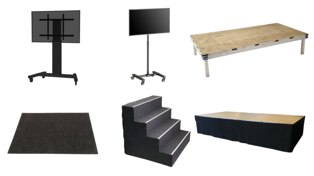 Voor presentaties of optredens leveren wij beeldschermen en stevige podia, passend bij jouw evenement.
